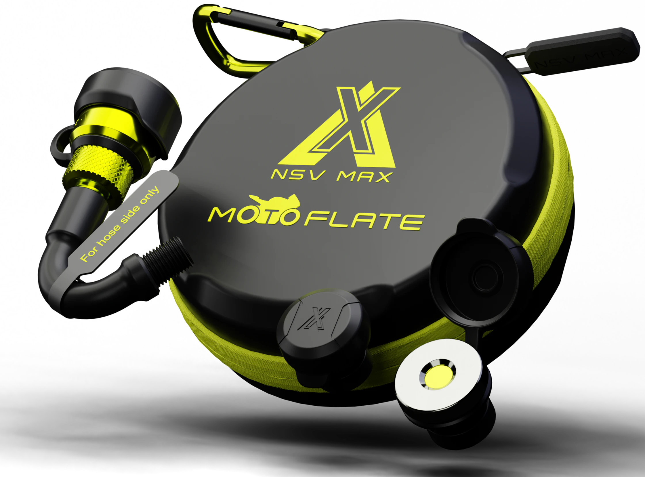 The NSV MAX MOTOFLATE is a patent-pending, CNC-machined billet aluminium adapter system specifically designed to solve the tight-space challenges of motorcycle tire inflation.